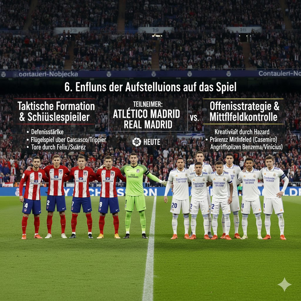 Die aufstellungen: teilnehmer: atlético madrid gegen real madrid ändern sich oft leicht je nach Verletzungen oder Sperren, bleiben aber taktisch konstant.